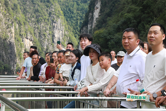 “神农溪”观光游船缓缓前行,游客走出船舱,听导游讲解溶洞奇观,赏溪畔山峰,拍照留念。
