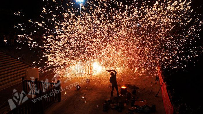 夜幕降临,表演者一手拿着盛满铁水的器具,另一只手奋力挥棒击打,滚烫的铁水被猛力击向天空,瞬间化作璀璨夺目的金花,照亮整个夜空,倒映在神农湖水面,岸上岸下,流光溢彩,美轮美奂。