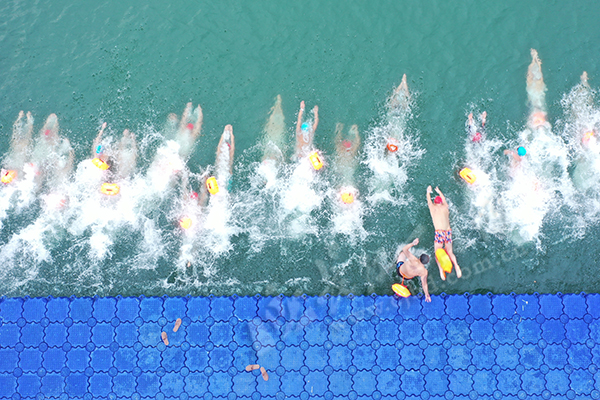 参赛选手们在水中或蝶泳、或仰泳、或蛙泳、或自由泳,个个奋勇争先,激起片片水花,上演水上竞赛速度与激情。岸上,观众们屏气凝神,专注地观看运动员们的每个动作,恐怕错过每个精彩的瞬间。选手们有的“偏离航道”,有的“中途撞车”,有的“原地踏步”,令岸上观众捧腹大笑,场面热闹非凡。