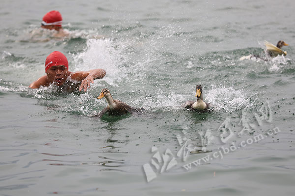 随着裁判员哨声响起,参赛选手应声入水,向水里的鸭子发起冲刺,受到惊吓的鸭子和参赛运动员玩起了“躲猫猫”,有的奋力追赶鸭子,有的将鸭子赶到角落后来个“瓮中捉鳖”。运动员们上岸后,将捉到手的鸭子迅速递给裁判员现场登记,又迅速“鱼跃”跳入水中,不少选手将手中的“战利品”高高举起,引来场边观众的阵阵喝彩,现场气氛火爆,好不热闹。