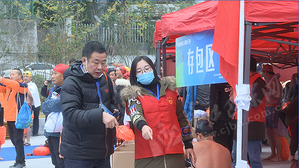 在开幕式现场,随处可见穿着红马甲的志愿者的身影,他们有的高举着各参赛队的队牌,有的挥舞着扫帚清扫垃圾,有的坚守在物品存放点守护队员们的物品,全力服务冬泳赛。