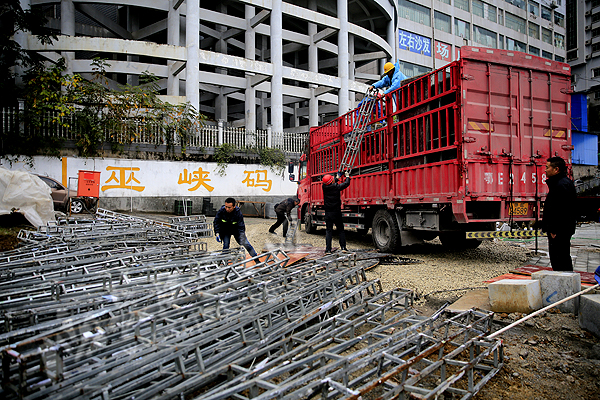在江南亲水广场冬泳赛活动筹备现场,工作人员正加紧运送会场舞台钢管。为加快会场舞台搭建进度,责任单位增派工作人员,在当天内完成了舞台和外围指示板的搭建。