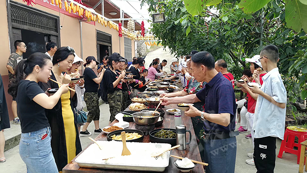7月25日,40名游客正在巴东县野三关镇庙坪村核桃庄园体验长桌宴。腊蹄子、坑洋芋、合渣洋芋等土家菜,令游客们大饱口福。